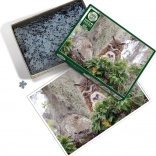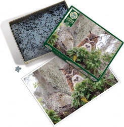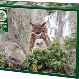 La représentation détaillée d’un grand-duc adulte et de son petit dans une végétation verdoyante intensifie l’atmosphère naturelle et fait de ce puzzle une image décorative captivante.