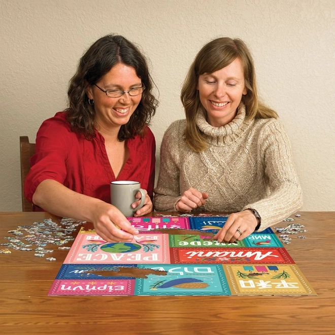 Ce puzzle design porte un message fort – la paix est universelle. La rangée du haut présente le japonais, l’hébreu, le grec et l’allemand ; au centre, vous trouverez le swahili (rouge), le russe, l’ukrainien et d’autres langues slaves utilisant l’alphabet cyrillique (turquoise), l’afrikaans, le néerlandais (vert) et l’anglais. La rangée du bas complète avec l’arabe, l’hindi et le français.
