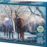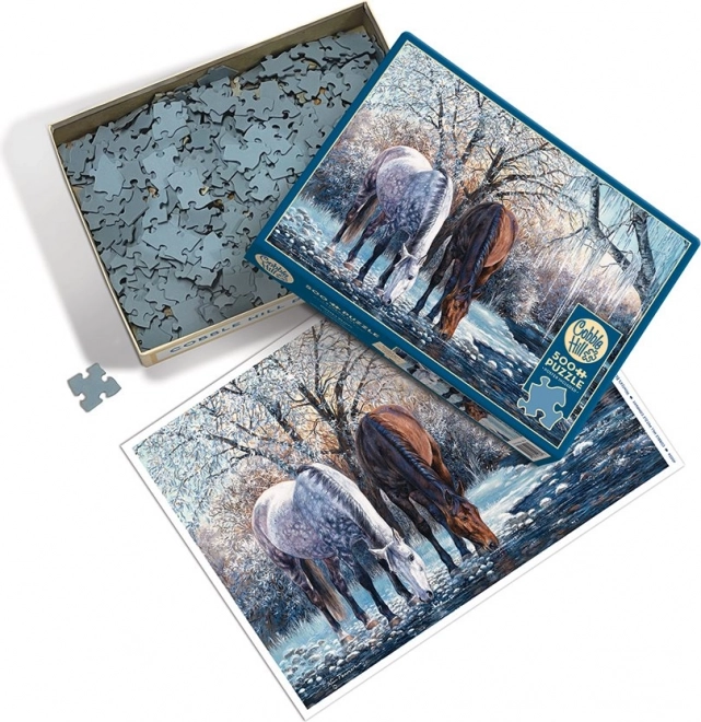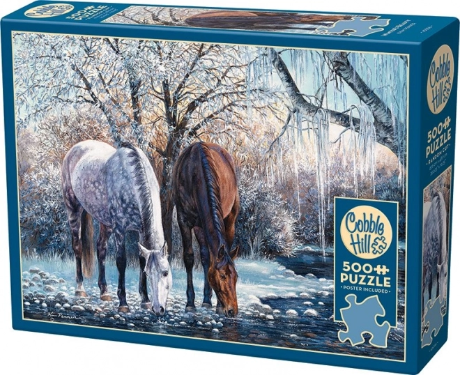 Profitez de l’atmosphère hivernale paisible avec une image de deux chevaux près d’un ruisseau gelé.