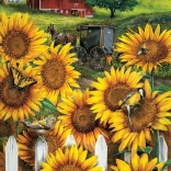 Un joyeux motif campagnard rempli de tournesols, d’oiseaux et de papillons enrichira votre collection d’une pièce visuellement saisissante.