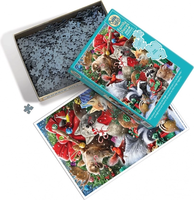 Ce puzzle familial divise l’illustration en zones avec des tailles de pièces différentes — grandes pour les plus jeunes enfants, moyennes pour les enfants plus âgés et les grands-parents, et petites pour les adultes. Ainsi, chacun trouve sa partie et l’assemblage se déroule ensemble, naturellement et sans frustration.