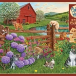 Une scène villageoise avec des chats, des fleurs, un petit étang et une grange rouge apporte de la joie et une image colorée et détaillée une fois assemblée.