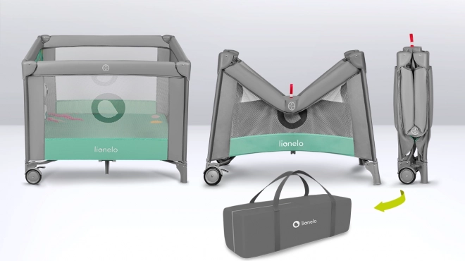 Le parc est équipé de deux roues avec frein et d'un sac de transport pratique pour un déplacement facile.