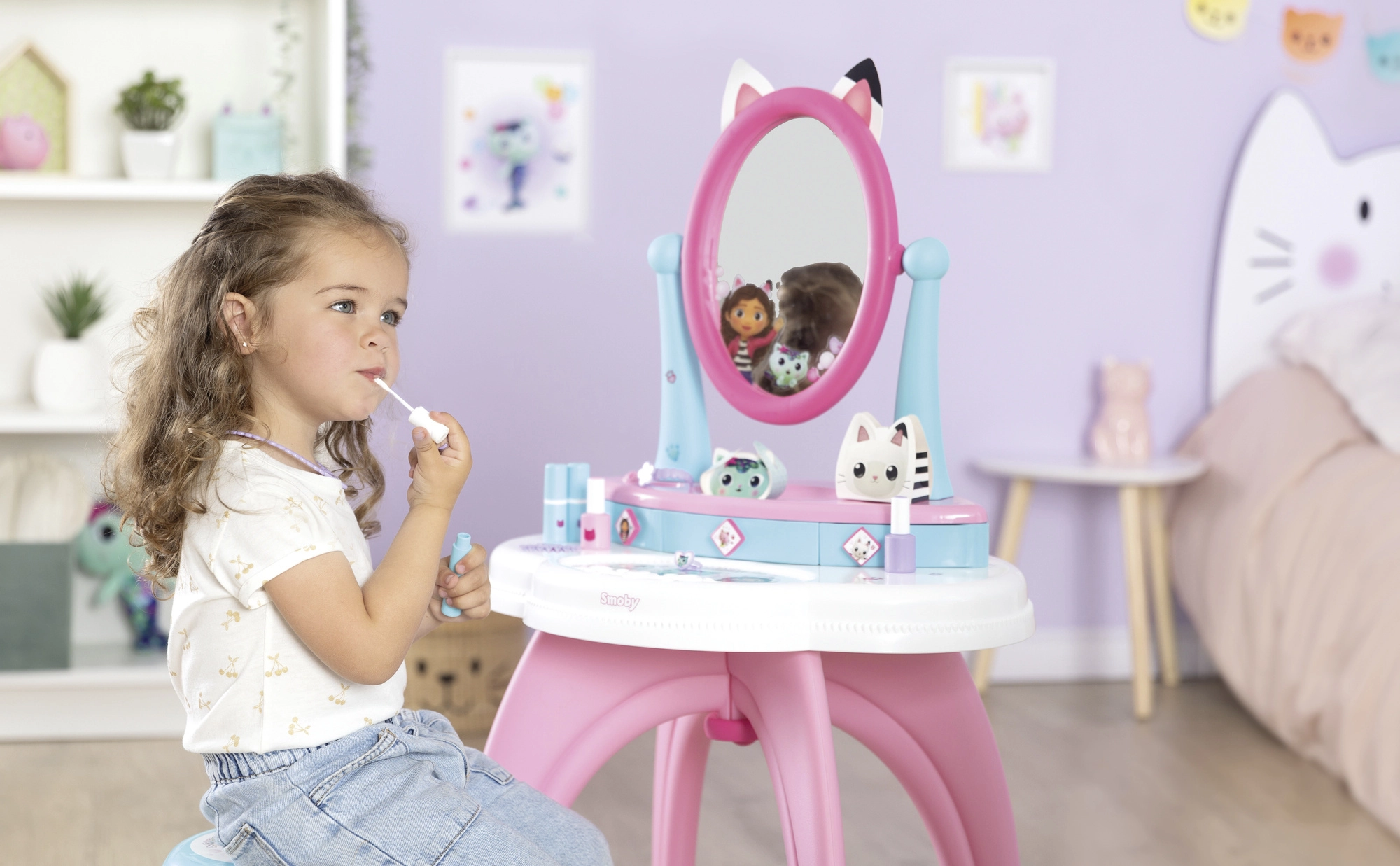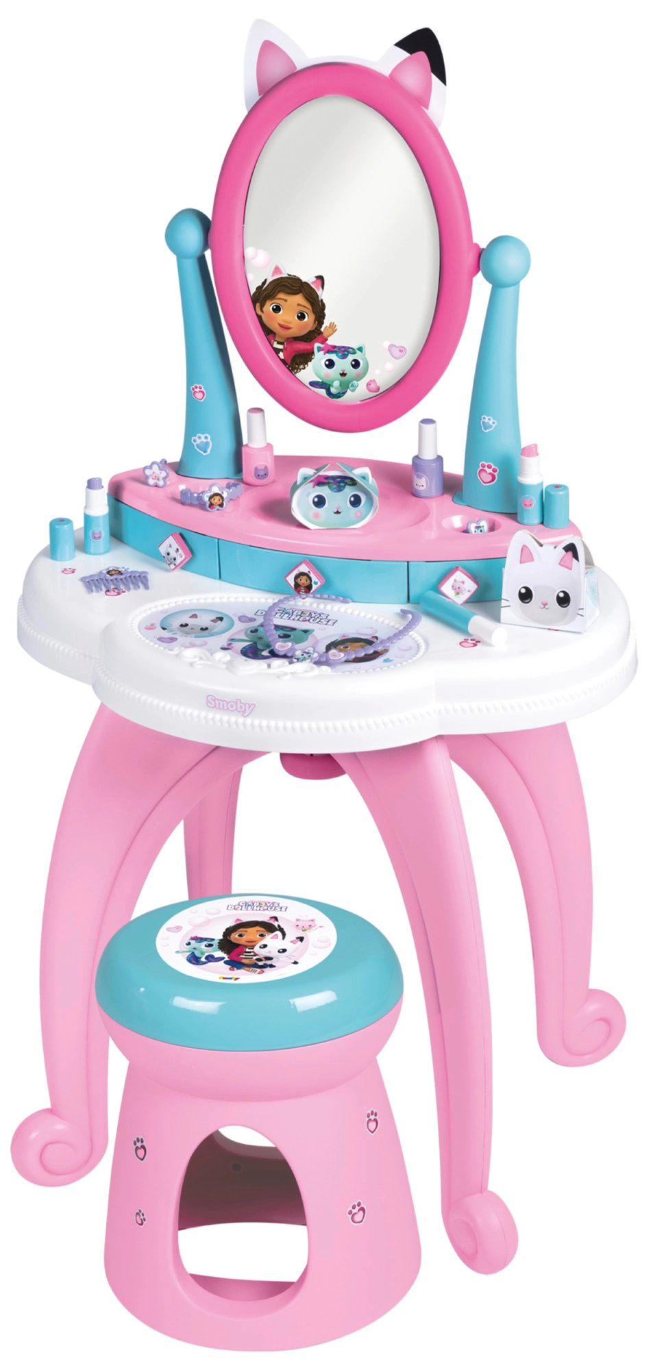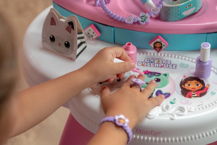 La coiffeuse pour enfants inspirée de la série préférée GABBY’S DOLLHOUSE transforme la chambre en petit studio de beauté. Grâce au grand miroir réglable, aux trois tiroirs et au riche ensemble d’accessoires, tout est à portée de main pour un jeu réaliste et sûr.
