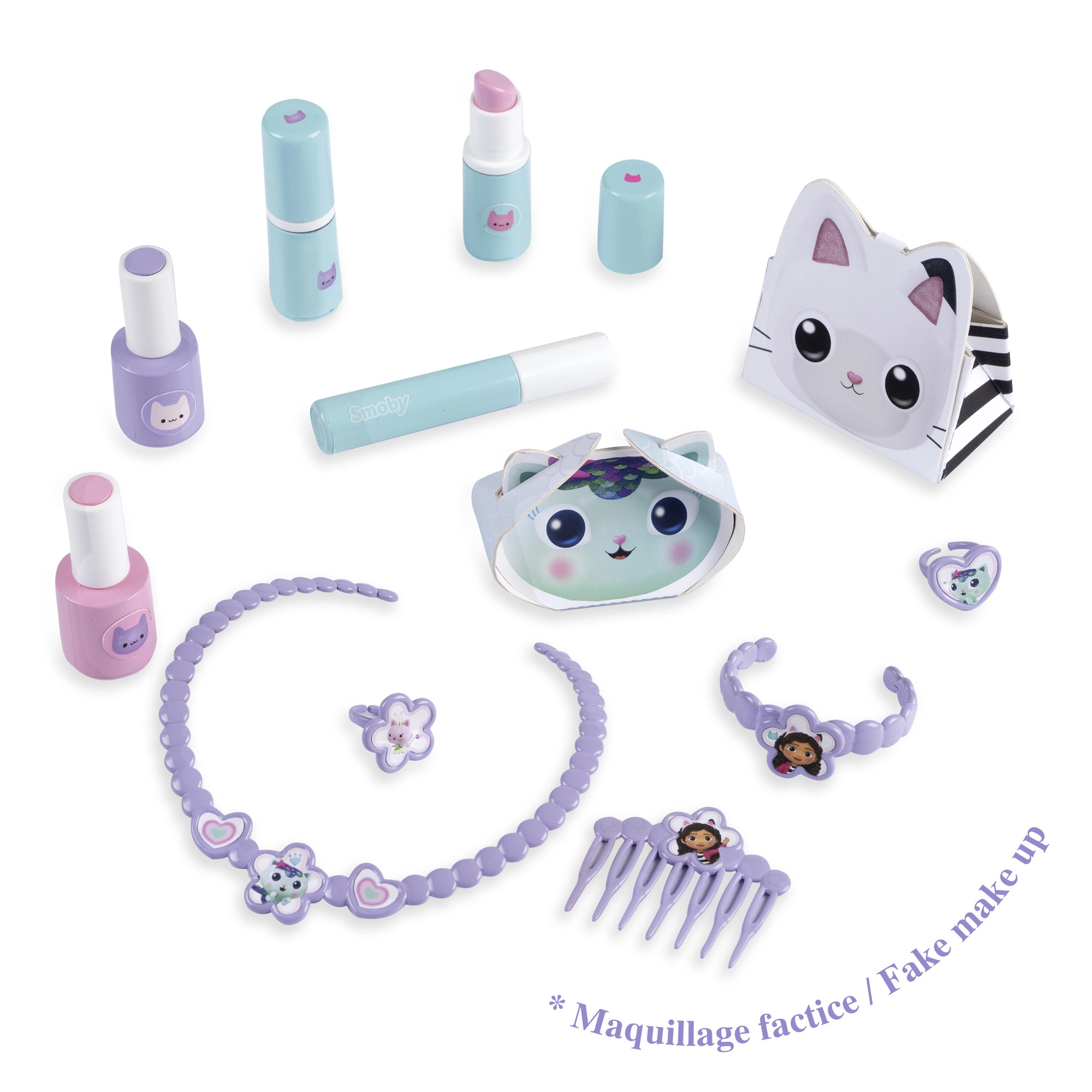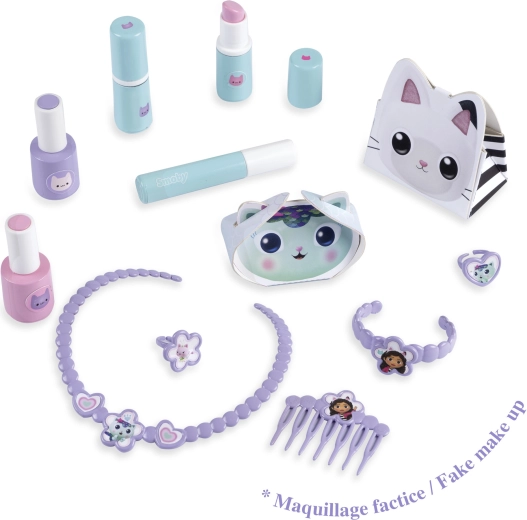 Inclus : flacons « cosmétiques », rouges à lèvres, mascara, peigne, collier, bracelet, bagues et plus encore pour un jeu réaliste.