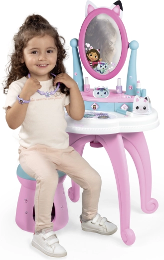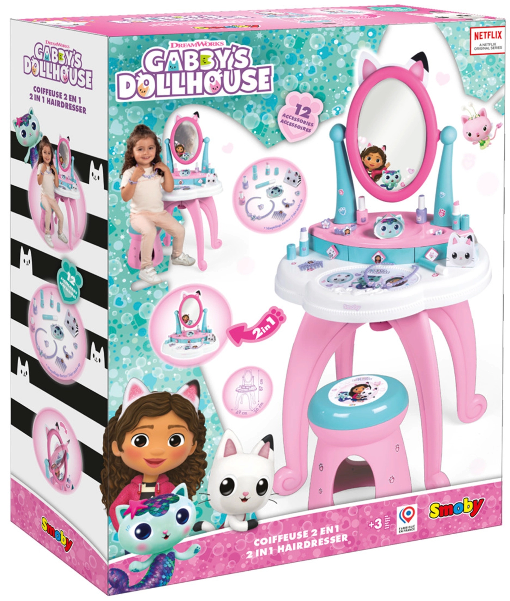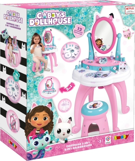 Entrez dans le monde magique de GABBY’S DOLLHOUSE avec la coiffeuse 3‑en‑1 pour enfants de Smoby. Elle propose brushing, maquillage et soin des ongles, dispose d’un grand miroir orientable, de 3 tiroirs et d’un tabouret confortable. Le coffret comprend 12 accessoires pour un jeu créatif qui stimule l’imagination.