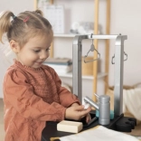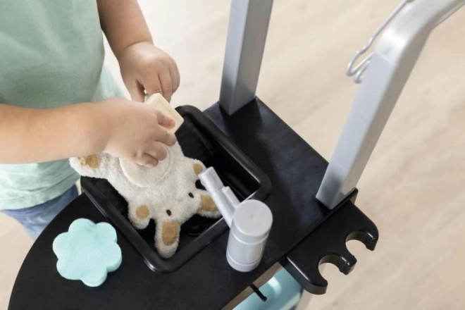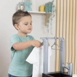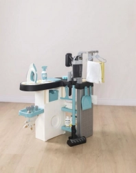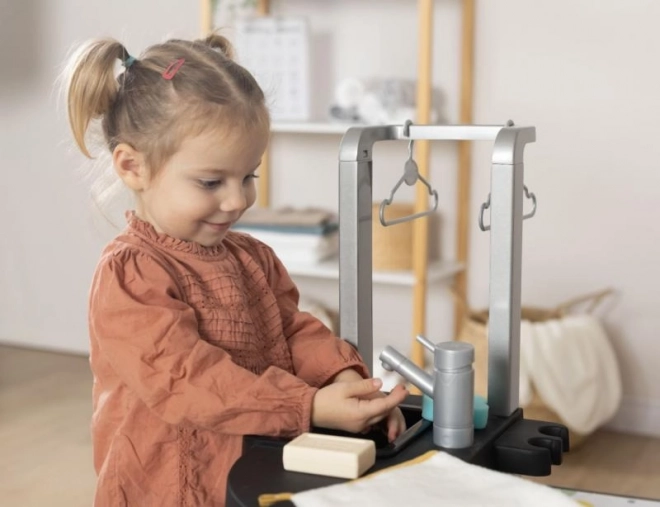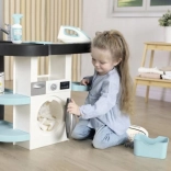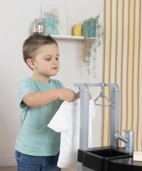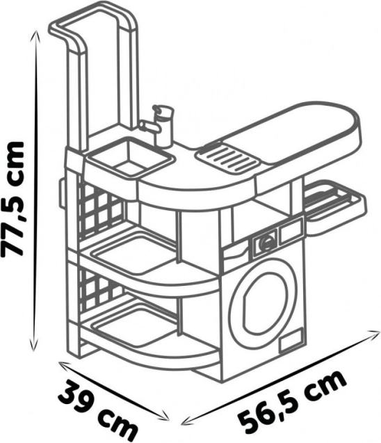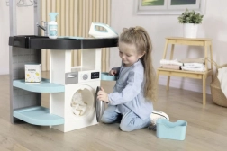 Les enfants peuvent utiliser quatre zones différentes : machine à laver, lavabo, surface de séchage et planche à repasser. Chaque partie est conçue pour créer des situations de jeu authentiques.