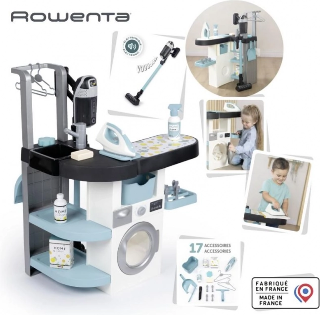 La buanderie pour enfants avec fer et aspirateur Rowenta est un choix idéal pour les petits aides de la maison. Elle comprend quatre zones de jeu : machine à laver, lavabo pour lavage à la main, zone de séchage et planche à repasser, qui apprennent aux enfants les tâches domestiques.
