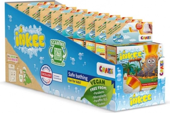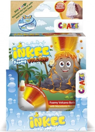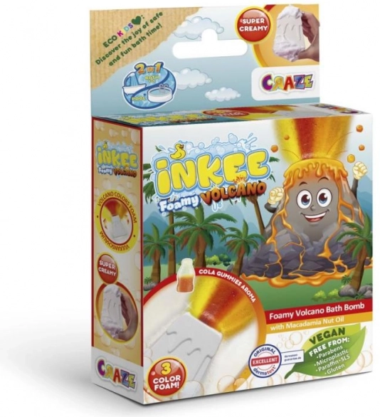 INKEE Foamy Volcano est une grande bombe de bain de 110 g en forme de volcan qui, une fois plongée dans l’eau, libère un flux de jaune, rouge et orange pour un superbe effet d’éruption. En se dissolvant, elle colore l’eau d’un magnifique orange et embaume la salle de bain d’un mélange de parfums de fraise et de cola gummies.