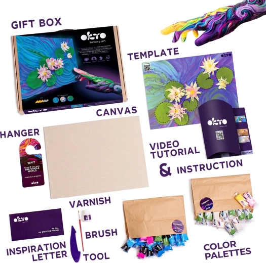 Découvrez la joie de créer avec le kit artistique Okto « Nénuphars » au format 30 × 40 cm. L’emballage contient tout le nécessaire pour votre propre œuvre d’art : toile naturelle, pâtes à modeler, vernis acrylique diluable à l’eau, pinceau, outil de modelage en bois et des instructions claires.