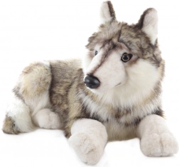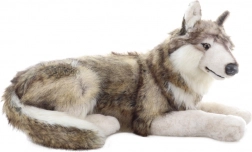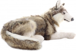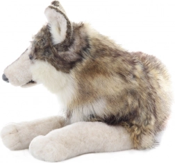 Le loup en peluche a une apparence réaliste avec des détails en couleurs et motifs qui imitent une véritable fourrure de loup.