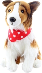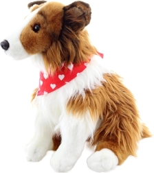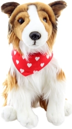 Cette jouet en peluche en forme de chien colley à poil long est recouvert d'une peluche douce marron et blanche, idéale pour les enfants dès la naissance. Elle est équipée d'un foulard rouge avec des petits cœurs blancs qui ajoutent à son charme.