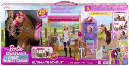 Découvrez la magie de l’univers équestre avec le playset Barbie Ultimate Stable inspiré de la série Barbie Mysteries: The Great Horse Chase. Plus de 25 pièces et 6 zones de jeu pour une créativité sans limite – du nourrissage et des soins aux entraînements de saut et à l’exposition des trophées. Le cheval a une longue crinière et une longue queue à coiffer et styliser, la poupée plie les genoux pour une monte réaliste et l’écurie se plie facilement pour le rangement.