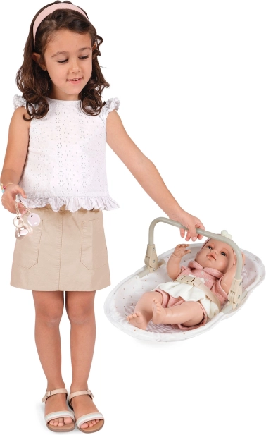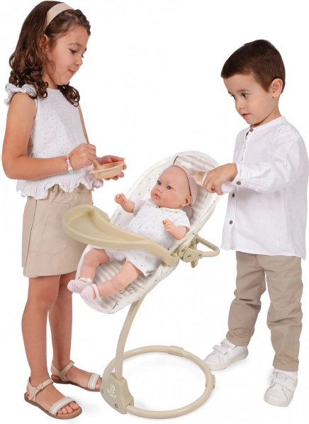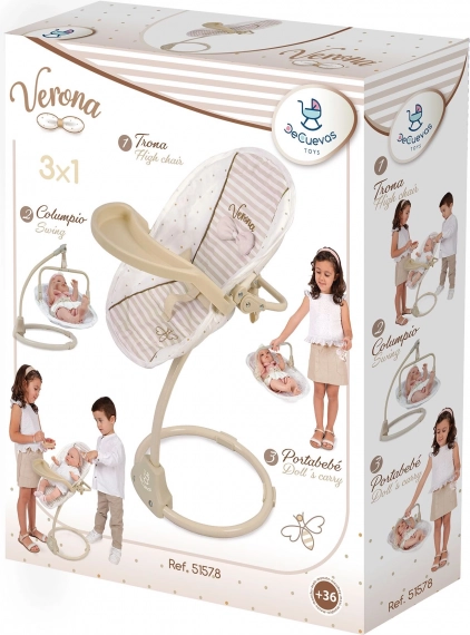 Cette chaise haute et balançoire multifonction 3-en-1 de la collection Verona offre un jeu réaliste et de nombreuses possibilités de soin pour la poupée préférée des enfants. L’association du beige clair et du blanc, rehaussée de motifs à pois ou rayures, d’un liseré discret et de petits nœuds, crée un look naturel intemporel inspiré du design espagnol.