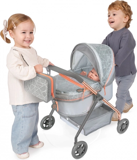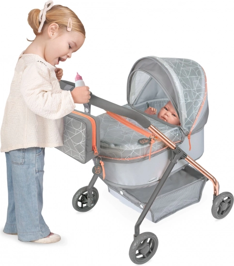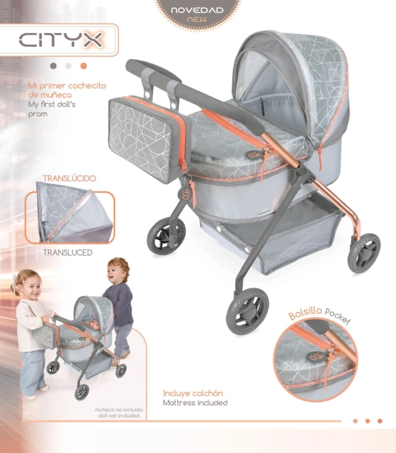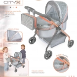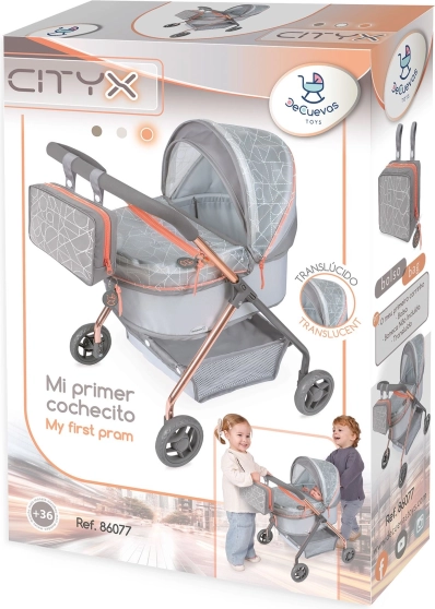 La collection CITY X 2024 associe des textiles premium à un PVC imprimé qui crée un effet de surfaces « vitrées ». La finition élégante gris‑argent est rehaussée de détails cuivrés tendance qui soulignent la légèreté et l’aération de la poussette. Grâce à sa poignée basse et à son châssis stable, la poussette convient parfaitement aux très jeunes demoiselles et est idéale pour le jeu de rôle et le développement de l’imagination.