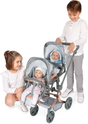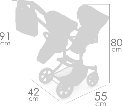 La poussette est un excellent choix pour les petites écolières: les deux nacelles séparées peuvent être placées face ou dos à la marche, les poupées sont sécurisées par des harnais 3 points et des poches transparentes zippées gardent les petits objets. La poignée réglable en hauteur (61–91 cm) grandit avec l’enfant et les roues avant pivotantes garantissent une conduite fluide.