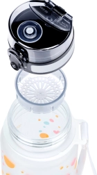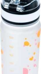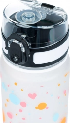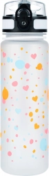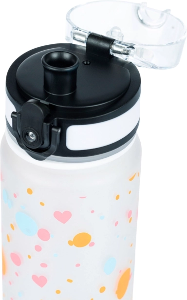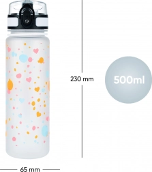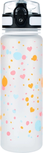 Bouteille stylée en tritan d’une capacité de 500 ml avec motif de petits cœurs, idéale pour l’école, le sport et les sorties. Elle offre un couvercle verrouillable étanche, une dragonne pratique et un filtre intérieur pour les fruits ou le thé. Fabriquée en tritan sûr, sans BPA, sans odeur et adaptée aussi aux boissons chaudes.