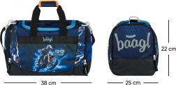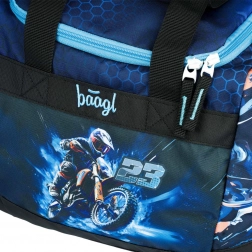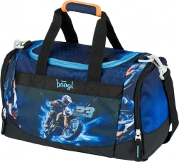 Sac de sport pour enfants BAAGL léger et pratique avec motif de moto, idéal pour les activités, les entraînements et comme bagage à main. Il offre une grande compartimentation principale avec un large couvercle pour un emballage facile, une poche séparée pour les chaussures, une bandoulière amovible et réglable pour le porter à l’épaule et un fond renforcé et déperlant. Des fermetures éclair YKK fiables assurent une ouverture fluide et des éléments réfléchissants augmentent la sécurité des enfants par faible luminosité.
