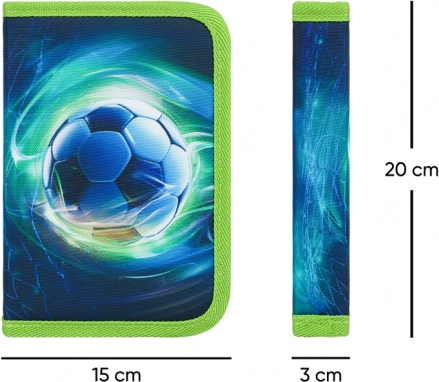 Trousse scolaire pratique à un seul compartiment avec deux rabats, offrant un rangement clair pour les fournitures d’écriture. Elle possède une fermeture éclair de qualité, est vendue vide et séduit par son design sportif de football dans des tons bleu‑vert.