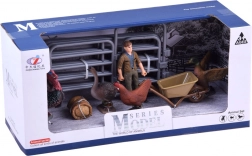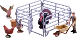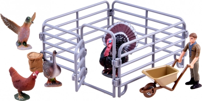 - Dindon, coq, oie, canard, fermier avec brouette, mangeoire/sac de nourriture, éléments d’enclos