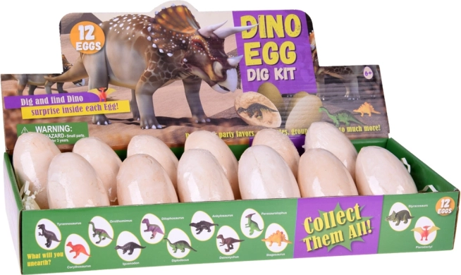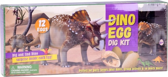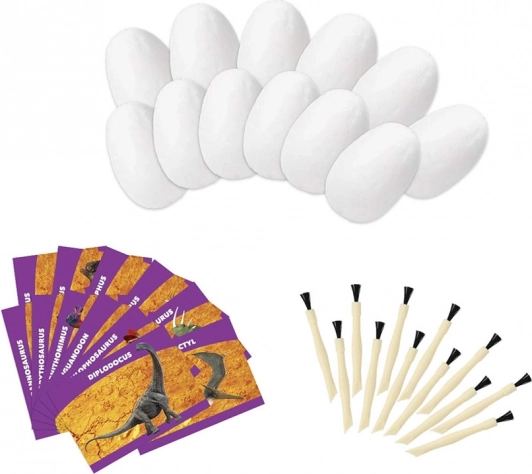 - 12 œufs en plâtre, 12 figurines de dinosaures (à l’intérieur des œufs), 12 pinceaux, outils de fouille, 12 cartes informatives (EN)