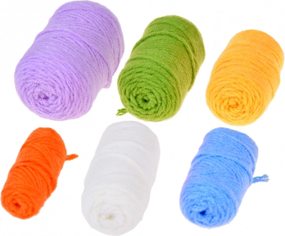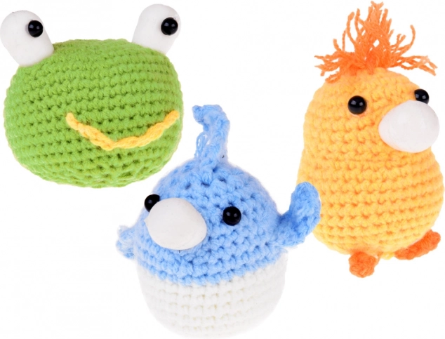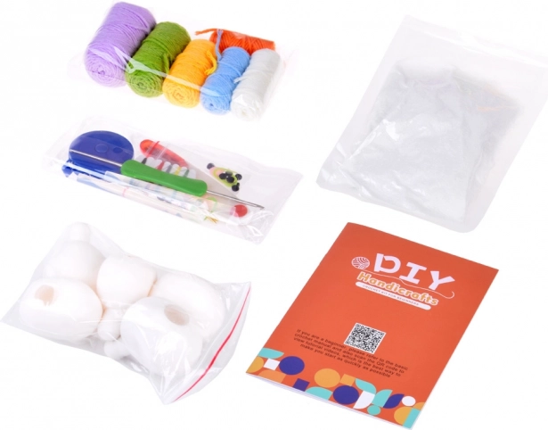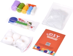 - 6× pelote de fil (écru, bleu, jaune, vert, violet, orange) ; 5× ballon en caoutchouc pour le remplissage ; rembourrage (ouate) ; crochet 2,5 mm ; ciseaux de sécurité ; 2× aiguille de sécurité ; yeux autocollants ; 10× épingle/repère à fermeture ; mètre ruban ; colle chaude en bâton ; notice illustrée (EN)