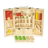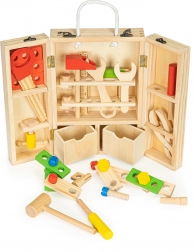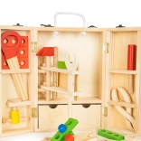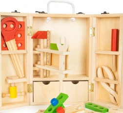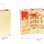 La caisse contient des compartiments spéciaux et un mur rabattable avec des supports d'outils, assurant un accès facile et de l'ordre. Grâce à la grande variété de composants, votre enfant peut construire des structures simples et améliorer ses compétences dans des domaines tels que l'écriture, le dessin ou l'habillage.