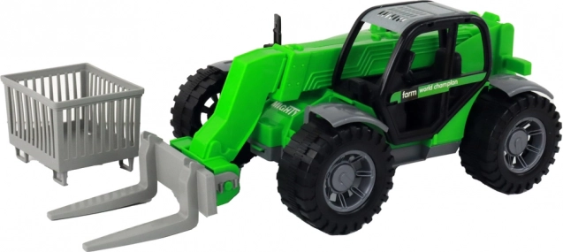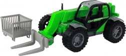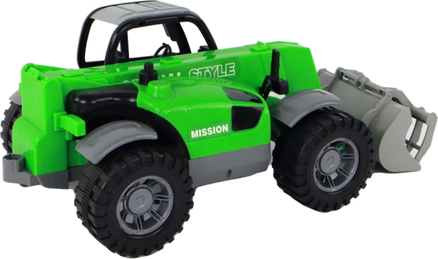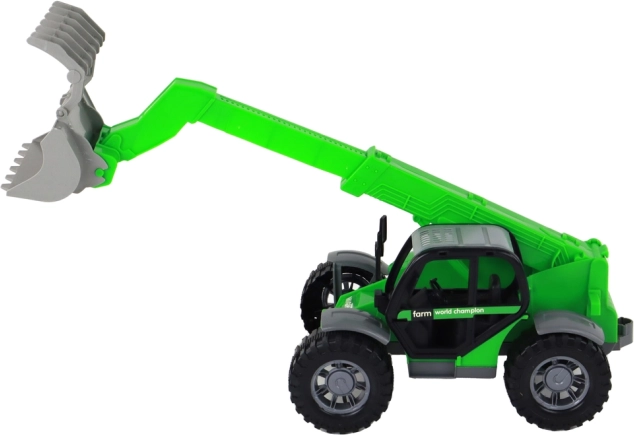 Tracteur vert robuste pour enfants avec bras télescopique et trois accessoires interchangeables, offrant un jeu réaliste à la maison comme en plein air. Grâce à la traction par friction, aux grandes roues et à la cabine transparente, il développe la motricité et l’imagination. Sont inclus des fourches, un panier et une pince à bois pour différents types de chargement et de transport.