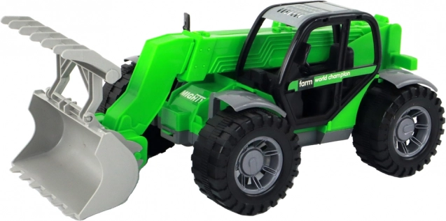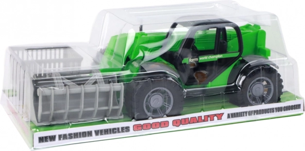 Tracteur vert avec bras télescopique et accessoires interchangeables