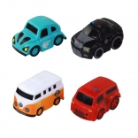 Un ensemble de quatre petites voitures aux styles et couleurs variés développe la motricité et l’imagination.