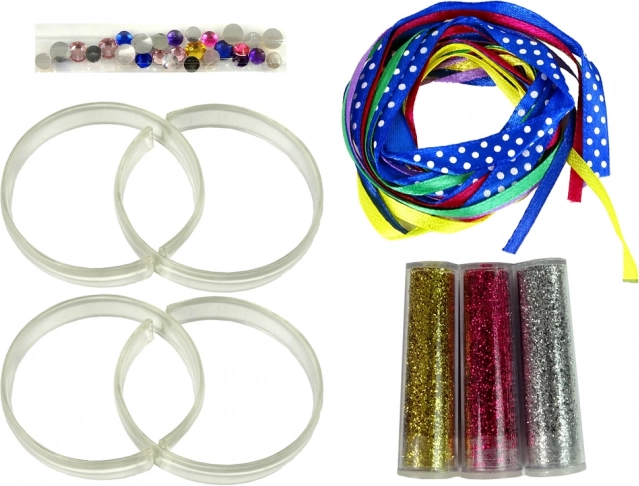 Contenu de la boîte : 4 bracelets transparents, 3 paillettes (or, argent, rose) et des rubans de différentes couleurs. Le kit est présenté dans une boîte décorative, parfaite comme cadeau. Recommandé pour les enfants dès 8 ans. Contient de petites pièces.