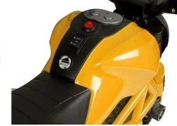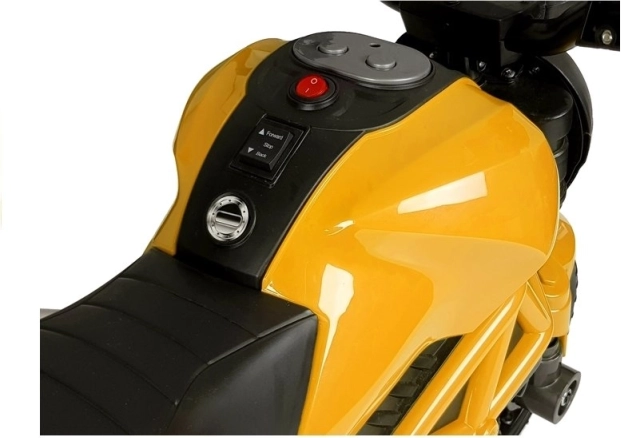 La moto électrique pour enfants compacte GTM1188 en couleur jaune offre une conduite stable, un look réaliste et une manipulation simple. Elle dispose d’un corps robuste, de petites roulettes latérales de stabilisation intégrées, d’une marche arrière et d’un point mort, ainsi que d’un phare LED aux couleurs changeantes. Son moteur silencieux de 35 W entraîne la roue arrière et permet d’atteindre jusqu’à 3 km/h. Idéale pour les enfants dès 3 ans jusqu’à 25 kg, avec la certification CE pour un jeu en toute sécurité.