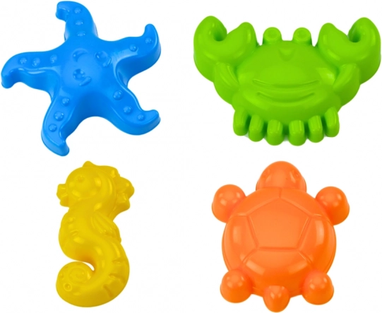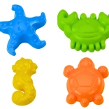 Quatre moules en forme d’animaux marins permettent aux enfants de réaliser diverses sculptures de sable tout en découvrant la vie marine.