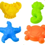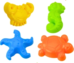 Contient des moules en forme de crabe, d'hippocampe, d'étoile de mer et de tortue pour une création artistique dans le sable.