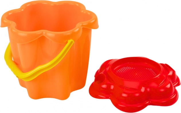 Le seau est équipé d'un couvercle en forme de fleur, qui sert de tamis à sable, ajoutant une autre dimension aux jeux de sable.