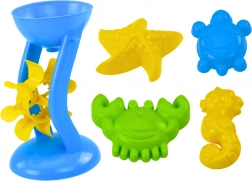 L'ensemble inclut également un moulin, qui peut être utilisé pour verser du sable ou de l'eau. Avec l'aide de la pelle et des râteaux, les petits constructeurs peuvent créer des châteaux et des tunnels ou chercher des trésors cachés. Les quatre moules marins en forme d'hippocampe, d'étoile de mer, de crabe et de tortue ajoutent à la créativité et au plaisir.