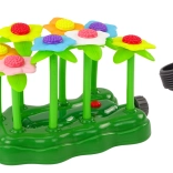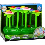 Après le raccordement du tuyau d’arrosage et l’ouverture de l’eau, la pression fait jaillir l’eau des fleurs, une excellente façon pour les enfants de passer du temps activement à l’extérieur.