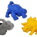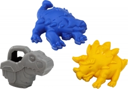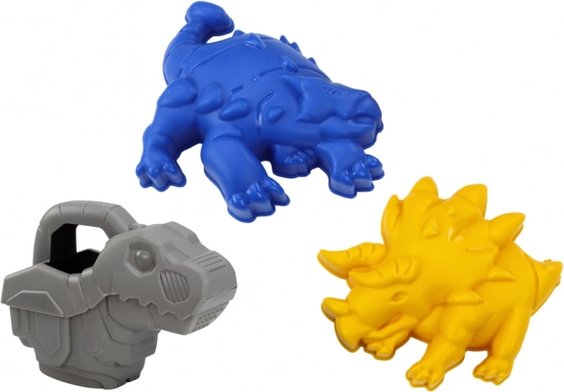 L’arrosoir dinosaure invite aux jeux d’eau et les moules (p. ex. tricératops) inspirent la création d’univers de sable thématiques.
