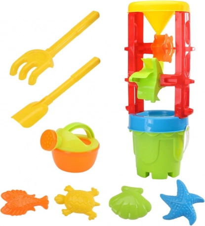 Ensemble coloré de jouets de sable avec grand moulin, seau et moules