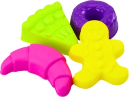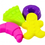 Quatre moules aux couleurs vives, en forme de donut, de biscuit pain d’épices ou de croissant, transforment le bac à sable en une boulangerie pleine d’imagination.