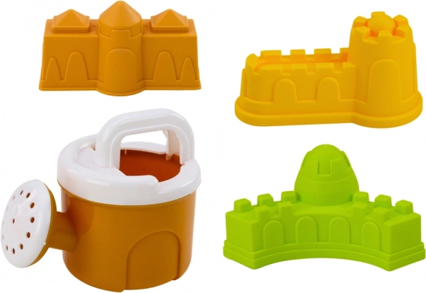 - Accessoires créatifs : 3 moules de châteaux, arrosoir, pelle et râteau.