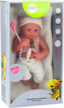 Adorable poupée bébé en tenue blanc‑rose avec bonnet, idéale pour les jeux d’imitation et de soin. Elle possède des traits du visage réalistes, des bras et jambes articulés, ainsi qu’une tétine avec cordon et une couverture douce. Finition de qualité et sûre, recommandée dès 18 mois.