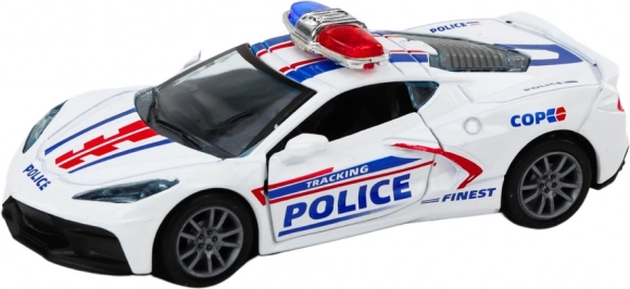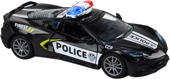 Elle est disponible en deux variantes de couleurs - blanc et noir, et la couleur est livrée aléatoirement pour une surprise lors de l'achat. La voiture est ornée de motifs de police authentiques, y compris des autocollants et des dispositifs de police caractéristiques sur le toit, qui peuvent être rouges ou bleus.