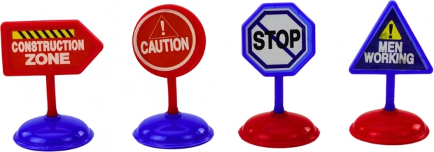 L'ensemble comprend 4 panneaux de signalisation éducatifs qui simulent un environnement de chantier et enseignent la sécurité routière.