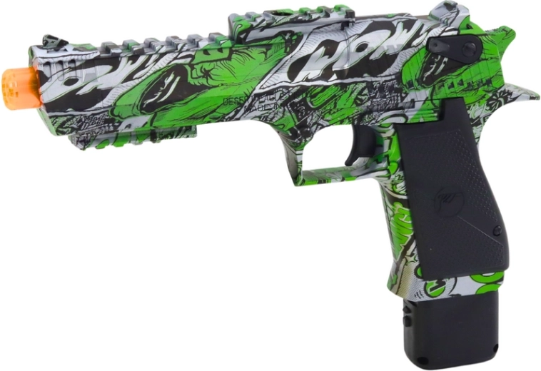 Le pistolet se distingue par son design dynamique – un vert intense qui lui confère énergie et attrait. Il est en outre orné d’éléments argentés pour un look futuriste et moderne. L’ensemble est décoré de motifs graffiti, lui donnant un caractère urbain et un style unique qui attire l’attention et le différencie des autres jouets.
