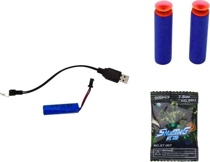 Le pistolet est alimenté par une batterie 3,7 V 500 mAh incluse dans le set. Un chargeur est fourni dans l’emballage.