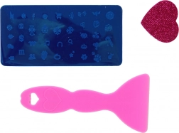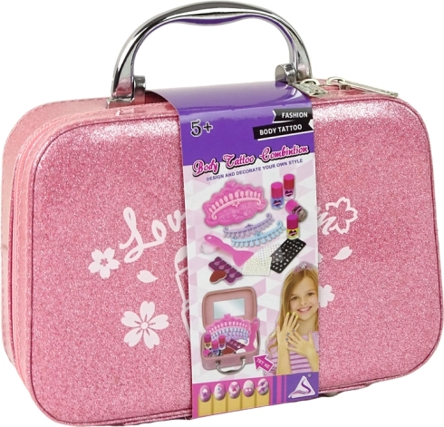 - Valisette rose pailletée avec miroir, 4 vernis à ongles colorés, séparateur d’orteils, lime, tampon, plaque de stamping avec motifs, grattoir/spatule, 3 pochoirs pour tips, autocollants pour tips, stickers et strass, petit récipient