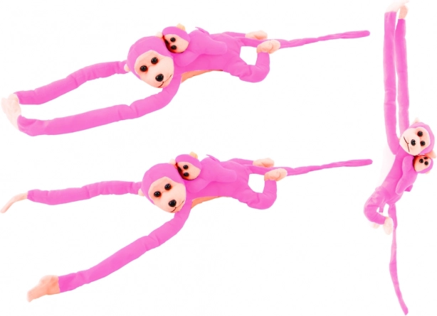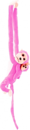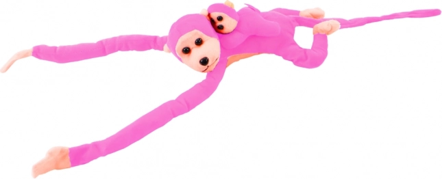 Adorable singe en peluche rose avec son bébé, longueur 70 cm, un compagnon tout doux pour les enfants. Grâce à ses longs membres avec fermeture auto-agrippante, vous pouvez facilement l’accrocher au lit ou au sac à dos. Matière douce, câlins confortables et certifications CE et EN71 en font un jouet sûr et amusant pour les enfants à partir de 3 ans.