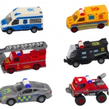 Le coffret contient six véhicules, tels qu’une voiture de police, un camion de pompiers et une ambulance, pour des situations de jeu réalistes.