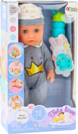 Sur le ventre de la poupée, un haut-parleur diffuse divers sons de bébé après avoir appuyé sur un bouton. Cette fonction développe l'imagination et les compétences auditives de l'enfant.